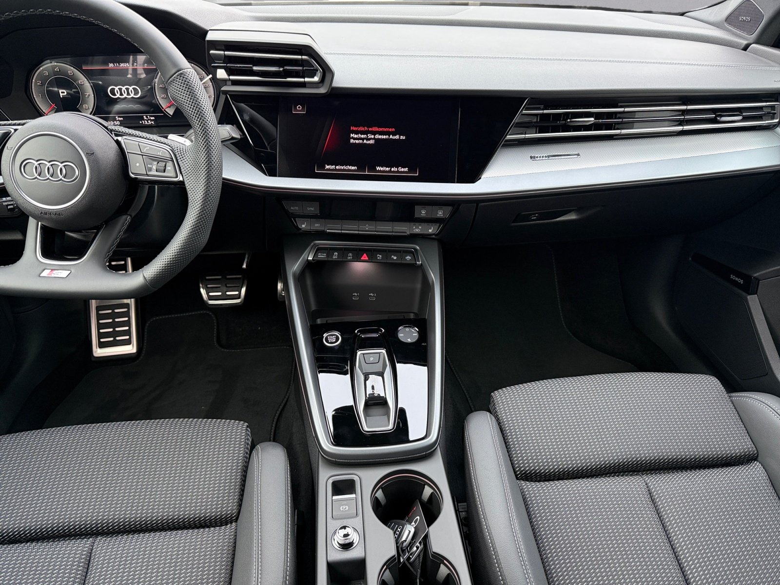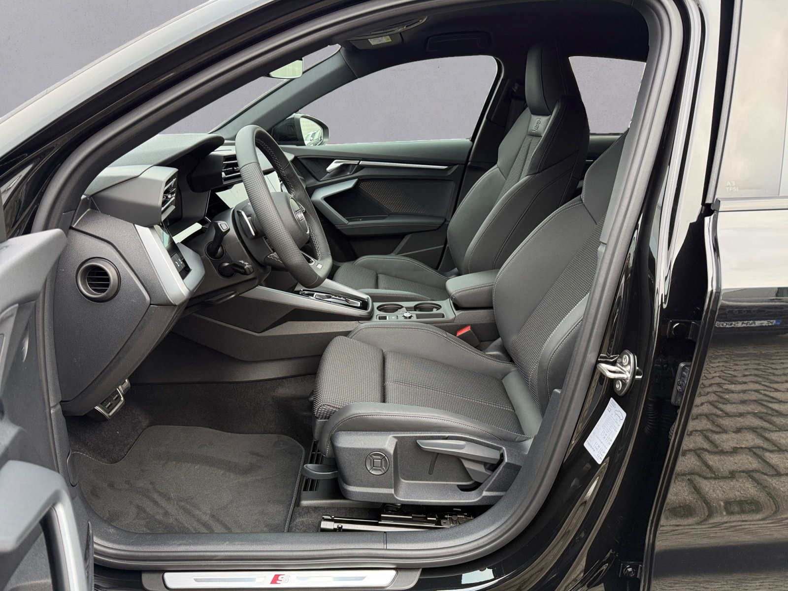 Sportfahrwerk für 19-Zoll-Räder, Vorbereitung für Anhängevorrichtung, Scheibenbremsen vorn. 16 Zoll, Audi drive select, Sportkontur-Lederlenkrad. 3-Speichen. unten abgeflacht mit Multifunktion plus und Schaltwippen, Räder Audi Sport. Vielspeichen S-Design. anthrazitschwarz. glanzgedreht. 8.0Jx19. Reifen 235/35 R19, Optikpaket schwarz plus, Dekoreinlage Aluminium Spektrum dunkel, Spurwechselwarnung mit Ausstiegswarnung und Querverkehrassistent hinten, Parkassistent plus mit Einparkhilfe mit Umgebungsanzeige, Adaptiver Geschwindigkeitsassistent, Betriebserlaubnis Nachtrag, Mobilfunk-Signalverstärker Typ 1, Audi connect Navigation & Infotainment plus, Audi Application Store und Smartphone-Interface, Interieur S mit Sportsitzen. Stoff/Kunstleder-Kombination schwarz, Matrix LED-Scheinwerfer. LED-Heckleuchten und Scheinwerfer-Reinigungsanlage, Klimatisierungspaket plus, Navigationspaket, Assistenzpaket Fahren und Parken plus, Assistenzpaket Schutz- und Warnsysteme plus, Komfortpaket plus, Ablage- und Gepäckraumpaket, Sonnenschutzverglasung abgedunkelt, Ambiente-Lichtpaket pro, Halteassistent, Businesspaket plus, Audi Neuwagen-Reifengarantie, Steuerungsnummer 8, Stabilisator vorn, Radstand, Stabilisator hinten, Einbau Differenzierung für Getriebe'DQ 200' -- Fahrzeugteile --, Mild-Hybrid, Mit spez.Schilder/Aufkleber/ Sicherheitszertifikate für Deutschland, 4-Lenker-Hinterachse, Standardabgasanlage, Fußmatten vorn und hinten, Bordliteratur in Deutsch, Gewichtsbereich 4 nur Einbausteuerung keine Bedarfsprognose, Kraftstoffsystem Otto-Einspritzer, BRS für Fahrzeuge mit E-Antrieb (ESC und eBKV), Aktivkohlebehälter (EVAP), spezielles Typschild EU, Reifenreparaturset, Gurtanlegekontrolle mit Sitzbelegungserkennung hinten, Scheibenbremsen hinten. 15 Zoll, Elektromechanische Servolenkung, Radschrauben Standard, Bordwerkzeug,Verbandmaterial mit Warndreieck, Frontantrieb, Serienkraftstoff-Erstbefüllung,Fahrzeugklassen-Differenzierung-8Y0/8YF-,Stoßfänger S line, Aufkleber/Schilder. englisch-deutsch,Modellkennzeichnung am Heck, Kennzeichenträger hinten (ECE), Kindersitzbefestigung i-Size-konform auf Beifahrerseite und äußeren Fondsitzen. Top Tether für äußere Fondsitze, Dach ohne Glaseinsatz,Vordersitze manuell einstellbar, Kopfstützen hinten (3 Stück), Komfortöffnung Gepäckraumklappe, Ausweichassistent und Abbiegeassistent, Wärmeschutzverglasung Frontscheibe, Kindersicherung elektrisch, Komfortschlüssel ohne Safelock, Modul Boden hinten Ausführung 2, Airbags vorn. Beifahrerairbag deaktivierbar, Abgaskonzept. WLTP3 M1. N1-I//EU6EB,UWB fähiges Land und Trägerfrequenz 433.92 bis 434.42Mhz,Außenspiegel Fahrerseite asphärisch. Beifahrerseite konvex, Folienbeklebung,Kopfstützen vorn,Seitenairbags vorn mit Kopfairbagsystem und Interaktionsairbag vorn, Außenspiegelgehäuse in Wagenfarbe, 'Basis', Spurverlassenswarnung mit Notfallassistent, Geschwindigkeitsbegrenzungsanlage, , USB-Anschlüsse mit Ladefunktion im Fond,Schalt-/Wählhebelknauf, Reifendruck-Kontrollanzeige, Start-Stop-System,Notbremsassistent vorn, Tagfahrlicht,Licht-/Regensensor, Doppelton-Signalhorn, Nicht Heissland,Riemenstartergenerator RSG 48V 110-250 A, Nichtraucherausführung,Kein Selbstabholer, Audi AG, S line, Serienqualität, Rechtsverkehr, Typprüfland Deutschland, Bauteilesatz ohne länderspezifische Bauvorschrift, 4-Zyl. Ottomotor 1.5 L/110 KW TSI Grundmotor ist: TJ7/N09/T9F/T57/T0D, Keine Aktionsausführung,ECO-Funktion, Aufmerksamkeits- und Müdigkeitserkennung, Regionscode ' ECE ' für Radio, without Service Package, Kein Sonderfahrzeug.Standard-Ausführung, Abwicklung Serie, Variante Grundausstattung, Vorbereitung für Functions on Demand, Räder der Audi Sport / Quattro GmbH, N.N.N. Ausführung 1, Dämpfung vorn, 7-Gang-Automatikgetriebe,Fahrzeuge mit besonderen Produktaufwertungsmaßnahmen,Reifen 235/35 R19 91Y xl, MMI Radio plus, Audi connect Notruf & Service mit Audi connect Remote & Control, Ottomotor, Batterie 420A (70Ah), Datenmodul Europa, Querverkehrassistent vorn, Sportlimousine, Kältemittel R1234yf, Linkslenker, Federbereich 28 nur Einbausteuerung keine Bedarfsprognose, Manueller Geschwindigkeitsbegrenzer, 4 Zyl.Ottomotor 1.5L Aggr. 05E.D, Steuerung SWIN,Motorabdeckung, Transportschutz (Ausf.1),Batterie/Generator Kapazität Standard, Gesetzlicher Notruf, Wartungsintervallverlängerung, Serviceanzeige 30000 km oder 2 Jahre ( variabel ), Mit Multifunktionskamera, Kamerabasierte Verkehrszeichenerkennung, Digitaler Radioempfang, Instrumenteneinsatz. Anzeige in KM/H, Reifen ohne Festlegung der Reifenmarke,