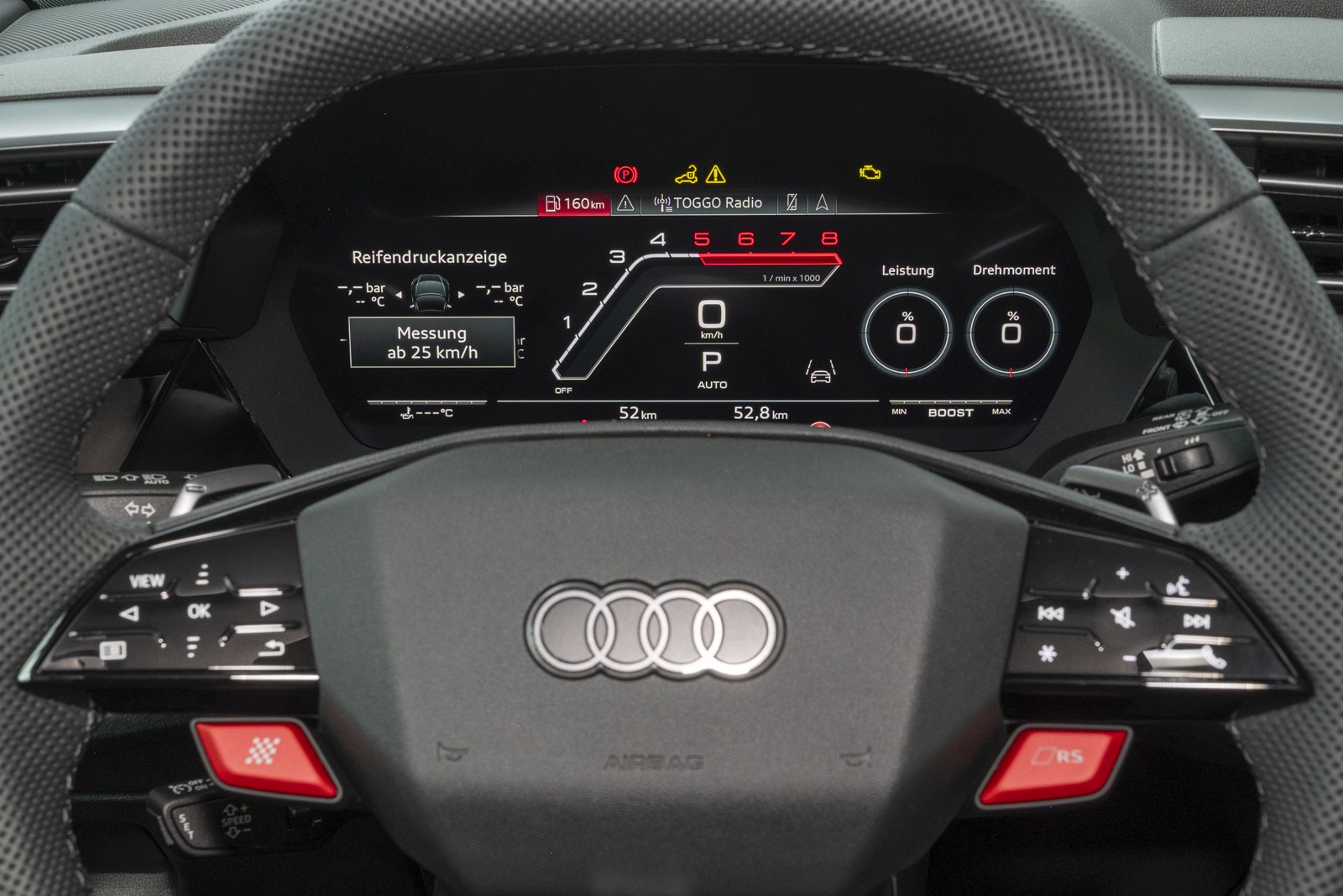 RS-Sportabgasanlage, Radschrauben diebstahlhemmend, Kindersitzbefestigung ISOFIX vorn Top Tether und i-Size für die äußeren Fondsitze, Panorama-Glasdach, Komfortöffnung Gepäckraumklappe, Wärmeschutzverglasung Frontscheibe, Seitenairbags vorn und hinten und Kopfairbagsystem, RS-Exterieurumfänge in Schwarz glänzend, Interieurelemente unten Mikrofaser Dinamica schwarz, Außenspiegelgehäuse in Wagenfarbe, Adaptiver Fahrassistent mit Notfallassistent, Anhebung der Höchstgeschwindigkeit auf 280 km/h, Reifendruck-Kontrollsystem, Dekoreinlage Mikrofaser Dinamica schwarz, Aschenbecher vorn und Zigarettenanzünder, Audi phone box, Betriebserlaubnis Nachtrag, LTE-Unterstützung für Audi phone box, Audi connect Navigation & Infotainment plus, Audi Application Store und Smartphone-Interface, Rückfahrkamera, Mikrofaser Dinamica/Leder-Kombination mit Wabensteppung und RS-Schriftzug in den Vordersitzlehnen, Motorraumabdeckung mit Carbonapplikation, Adaptives Fahrwerk mit Audi drive select, Komfortschlüssel in Verbindung mit Diebstahlwarnanlage, Matrix LED-LED Scheinwerfer-Heckleuchten und Scheinwerfer-Reinigungsanlage, Klimatisierungspaket plus, Navigationspaket, Komfortpaket plus, Assistenzpaket Fahren und Parken pro und Assistenzpaket Schutz- und Warnsysteme plus, RS-Schalensitze, Sonnenschutzverglasung abgedunkelt, Halteassistent, Garagentoröffner, Audi Neuwagen-Reifengarantie, Steuerungsnummer 8, Stabilisator vorn, Radstand, Stabilisator hinten, Einbau Differenzierung für Getriebe 'DQ 500' -- Fahrzeugteile --, Kraftstoffsystem Otto-Einspritzer mit rücklauffreiem Einspritzsystem Hochmot, Ohne alternativ-Antriebssystem, Mit spez.Schilder/Aufkleber/ Sicherheitszertifikate für Deutschland, 4-Lenker-Hinterachse, Fußmatten vorn und hinten, Bordliteratur in Deutsch, Gewichtsbereich 7 nur Einbausteuerung keine Bedarfsprognose, BRS für Fahrzeuge ohne E-Antrieb (ESC und eBKV), Aktivkohlebehälter (EVAP), spezielles Typschild EU, Reifenreparaturset, Gurtanlegekontrolle mit Sitzbelegungserkennung hinten, RS-Stahlbremse hinten mit Bremssätteln schwarz glänzend, RS-Stahlbremse vorn mit Bremssätteln schwarz glänzend, Progressivlenkung, Bordwerkzeug, Ohne zus. Triebwerks-Unterschutz, Verbandmaterial mit Warndreieck, quattro, Erhöh.der Serienkraftstofferstbefüllung, Ohne Elektromotor ( Hybrid ), Fahrzeugklassen-Differenzierung-8Y0/8YF-, Ohne Audi connect Schlüssel, Stoßfänger, Aufkleber/Schilder englisch-deutsch, Ohne zusätzliche Bereifung, Modellkennzeichnung am Heck, Sportkonturlenkrad 3-Speichen oben und unten abgeflacht mit Multifunktion Schaltwippen und Bediensatelliten, Kennzeichenträger hinten (ECE), Ohne Lehnenentriegelung für Vordersitze, Vordersitze manuell einstellbar, Kopfstützen hinten (3 Stück), Ausweichassistent und Abbiegeassistent, Kindersicherung elektrisch betätigt, Modul Boden hinten Ausführung 5, Airbags vorn Beifahrerairbag deaktivierbar, Abgaskonzept WLTP3 M1 N1-I//EU6EA, Optikpaket schwarz plus, Räder 5-Y-Speichen schwarz matt 9 0J|8 0Jx19 Reifen 265/30|245/35 R19, Ohne besondere Karosseriemaßnahmen, UWB fähiges Land und Trägerfrequenz 433 92 bis 434 42Mhz, S-Dachkantenspoiler, Außenspiegel Fahrerseite asphärisch Beifahrerseite konvex, Folienbeklebung, Kopfstützen vorn, Ohne Feuerlöscher, Seitenschweller Standard, Embleme, 'Basis', Dachhimmel Stoff schwarz, Ohne Netzkabel für Industriestecker für das e-tron Ladesystem, Ohne Ladekabel Mode 3 für öffentliches Laden (AC), USB-Anschlüsse mit Ladefunktion im Fond, Ohne Wärmespeicher/Zusatzheizung, Schalt-/Wählhebelknauf, Ledervariante 2, Audi virtual cockpit plus mit zusätzlichem RS-Layout, Start-Stop-System, Parkassistent mit Einparkhilfe plus, Verbau der Startbatterie hinten ohne zweite Batterie, Drehstromgenerator 180 A, Notbremsassistent vorn, Tagfahrlicht, Heckscheiben-Wisch-Waschanlage mit Intervallschaltung, Licht-/Regensensor, Scheinwerfer-Reinigungsanlage, Doppelton-Signalhorn, Nicht Heissland, Interieurpaket 6 ( Nur für AU/PO ), Ohne integriertes Mautsystem, Einstiegs-LED mit RS-Projektion vorn, Kein Selbstabholer, Audi Sport GmbH, Sport-Ausstattung, Serienqualität, Rechtsverkehr, Typprüfland Deutschland, Bauteilesatz ohne länderspezifische Bauvorschrift, 5-Zylinder-Ottomotor 2 5 L/294 KW (20V) (R-5) TFSI homogen Grundmotor ist: TM1/T4W, Keine Aktionsausführung, ECO-Funktion, Ablenkungs- und Müdigkeitserkennung, Regionscode ' ECE ' für Radio, Ohne Ladedose, Ohne Netzkabel für Haushaltsstecker für das e-tron Ladesystem, without Service Package, Kein Sonderfahrzeug Standard-Ausführung, Abwicklung Serie, Variante ' RS ', Vorbereitung für Functions on Demand, Räder der Audi Sport / Quattro GmbH, N.N.N. Ausführung 1, Dämpfung vorn, 7-Gang-Automatikgetriebe für Allrad, Ohne Vorkonditionierung, Ohne akustisches Fahrzeug-Warnsystem, Ohne zusätzliche Maßnahmen für Antriebssound innen, Fahrzeuge mit besonderen Produktaufwertungsmaßnahmen, Ohne Alcohol Interlock, Reifen performanceoptimiert 265/30|245/35 R19, MMI Radio plus, Audi connect Notruf & Service mit Audi connect Remote & Control, Ottomotor, Batterie 420A (75Ah), Datenmodul Europa, Sportback, Kältemittel R1234yf, Linkslenker, Federbereich 14 nur Einbausteuerung keine Bedarfsprognose, Mit Speedlimiter (LIM), Steuerung SWIN, Ohne Lade-Dock, Transportschutz (Ausf.1), Ohne Bedieneinheit Ladesystem, Batterie/Generator Kapazität Standard, gesetzlicher Notruf, Ablage- und Gepäckraumpaket, Wartungsintervallverlängerung, Serviceanzeige 30000 km oder 2 Jahre ( variabel ), Interieurapplikationen Vanadiumoptik, Mit Multifunktionskamera, Ambiente-Lichtpaket pro, Kamerabasierte Verkehrszeichenerkennung, Digitaler Radioempfang, 5 Zyl.Ottomotor 2 5L Aggr. 07K.4, Instrumenteneinsatz Anzeige in KM/H, Reifen ohne Festlegung der Reifenmarke, Pedalerie aus Edelstahl, RS-Einstiegsleisten, Innenfarbe: Blau