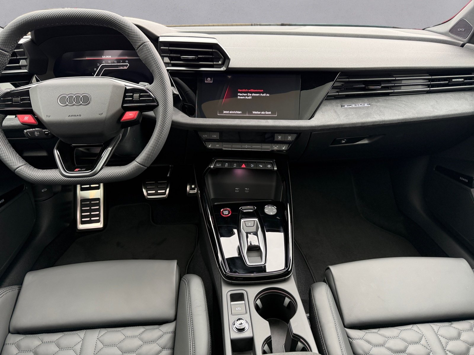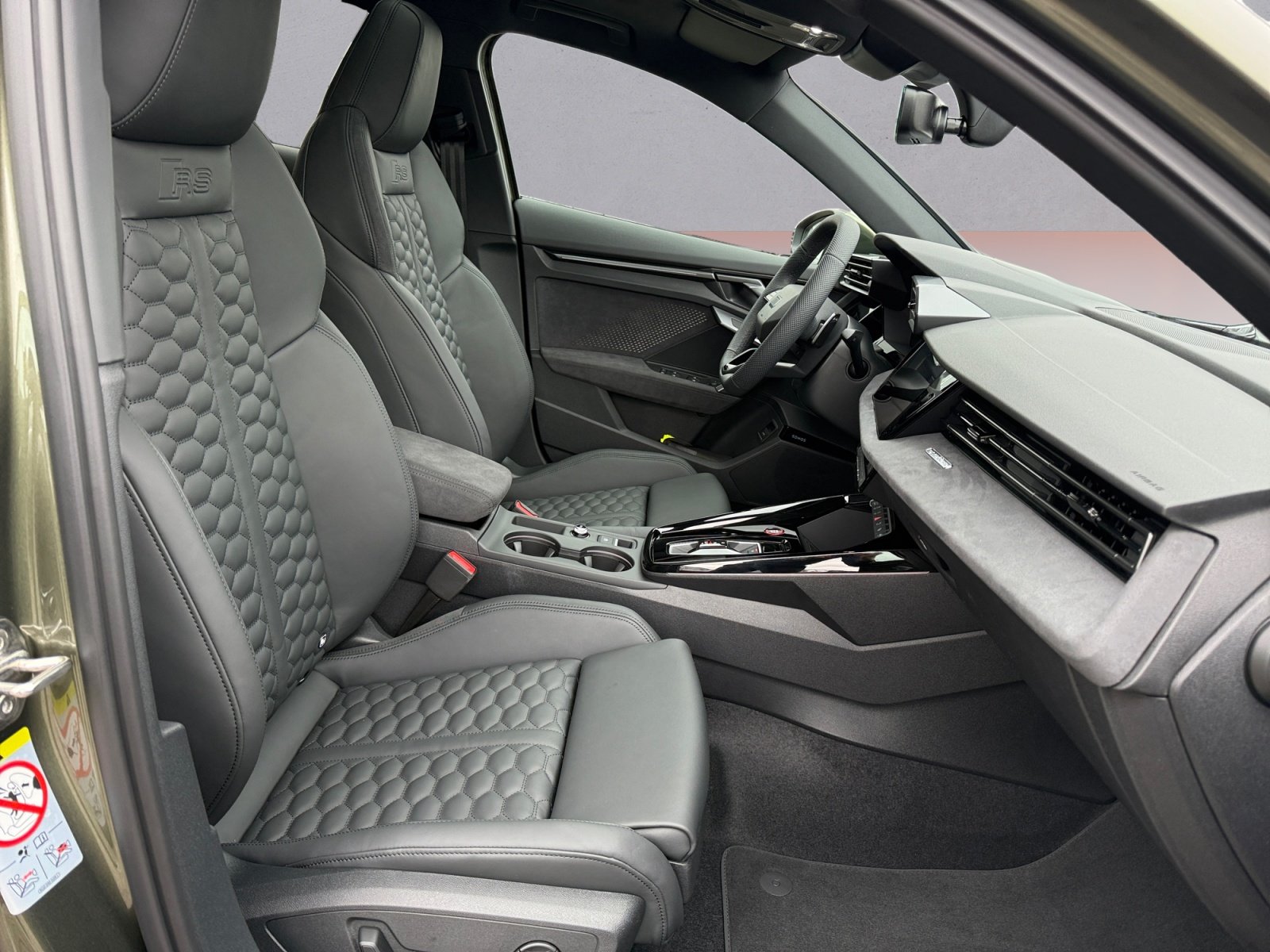 RS-Sportabgasanlage, Panorama-Schiebedach, Komfortöffnung Gepäckraumklappe, Wärmeschutzverglasung Frontscheibe, RS-Exterieurumfänge in Schwarz glänzend, Seitenairbags vorn und hinten mit Kopfairbagsystem und Interaktionsairbag vorn, Interieurelemente unten Mikrofaser Dinamica schwarz, Außenspiegelgehäuse in Wagenfarbe, Anhebung der Höchstgeschwindigkeit bis zu 280 km/h, Spurwechselwarnung mit Ausstiegswarnung und Querverkehrassistent hinten, Reifendruck-Kontrollsystem, Dekoreinlage Mikrofaser Dinamica schwarz, Parkassistent plus mit Einparkhilfe mit Umgebungsanzeige, Lendenwirbelstütze pneumatisch einstellbar mit Massagefunktion für die Vordersitze, Adaptiver Geschwindigkeitsassistent, Audi phone box, Betriebserlaubnis Nachtrag, Mobilfunk-Signalverstärker Typ 1, Audi connect Navigation & Infotainment plus, Audi Application Store und Smartphone-Interface, Leder Feinnappa mit Wabensteppung und RS-Prägung, Adaptives Fahrwerk mit Audi drive select, Komfortschlüssel in Verbindung mit Diebstahlwarnanlage, Komfortpaket pro, Matrix LED-Scheinwerfer. LED-Heckleuchten und Scheinwerfer-Reinigungsanlage, Klimatisierungspaket plus, Navigationspaket, Assistenzpaket Fahren und Parken plus, Assistenzpaket Schutz- und Warnsysteme plus, Sonnenschutzverglasung abgedunkelt, Halteassistent, Garagentoröffner, Audi Neuwagen-Reifengarantie, Steuerungsnummer 8, Stabilisator vorn, Radstand, Stabilisator hinten, Einbau Differenzierung für Getriebe 'DQ 500' -- Fahrzeugteile --, Kraftstoffsystem Otto-Einspritzer mit rücklauffreiem Einspritzsystem. Hochmot,Mit spez.Schilder/Aufkleber/ Sicherheitszertifikate für Deutschland, 4-Lenker-Hinterachse, Fußmatten vorn und hinten, Bordliteratur in Deutsch, Gewichtsbereich 7 nur Einbausteuerung keine Bedarfsprognose, BRS für Fahrzeuge ohne E-Antrieb (ESC und eBKV),Aktivkohlebehälter (EVAP), spezielles Typschild EU, Reifenreparaturset, Gurtanlegekontrolle mit Sitzbelegungserkennung hinten, RS-Stahlbremse hinten mit Bremssätteln schwarz glänzend, RS-Stahlbremse vorn mit Bremssätteln schwarz glänzend, Progressivlenkung, Radschrauben Standard, Bordwerkzeug,Verbandmaterial mit Warndreieck, quattro, Erhöh.der Serienkraftstofferstbefüllung,Fahrzeugklassen-Differenzierung-8Y0/8YF-,Stoßfänger, Aufkleber/Schilder. englisch-deutsch,Modellkennzeichnung am Heck, Sportkonturlenkrad. 3-Speichen. oben und unten abgeflacht mit Multifunktion. Schaltwippen und Bediensatelliten, Kennzeichenträger hinten (ECE), Kindersitzbefestigung i-Size-konform auf Beifahrerseite und äußeren Fondsitzen. Top Tether für äußere Fondsitze, Kopfstützen hinten (3 Stück), Ausweichassistent und Abbiegeassistent, Kindersicherung elektrisch, Modul Boden hinten Ausführung 5, Airbags vorn. Beifahrerairbag deaktivierbar, Abgaskonzept. WLTP3 M1. N1-I//EU6EB, Optikpaket schwarz plus, Räder. 5-Y-Speichen. schwarz matt. 9.0J|8.0Jx19. Reifen 265/30|245/35 R19,UWB fähiges Land und Trägerfrequenz 433.92 bis 434.42Mhz, S-Dachkantenspoiler, Außenspiegel Fahrerseite asphärisch. Beifahrerseite konvex, Folienbeklebung, Kopfstützen vorn,Embleme, 'Basis', Spurverlassenswarnung mit Notfallassistent, Dachhimmel Stoff schwarz, USB-Anschlüsse mit Ladefunktion im Fond,Schalt-/Wählhebelknauf, Ledervariante 2, Audi virtual cockpit plus mit zusätzlichem RS-Layout, Start-Stop-System, Verbau der Startbatterie hinten. ohne zweite Batterie, Drehstromgenerator 180 A, Notbremsassistent vorn, Tagfahrlicht, Heckscheiben-Wisch-Waschanlage mit Intervallschaltung, Licht-/Regensensor, Scheinwerfer-Reinigungsanlage, Doppelton-Signalhorn, Nicht Heissland, Interieurausstattung 8,Nichtraucherausführung, Einstiegs-LED mit RS-Projektion vorn, Kein Selbstabholer, Audi Sport GmbH, Sport-Ausstattung, Serienqualität, Rechtsverkehr, Typprüfland Deutschland, Bauteilesatz ohne länderspezifische Bauvorschrift, 5-Zylinder-Ottomotor 2.5 L/294 KW (20V) (R-5) TFSI. homogen Grundmotor ist: TM1/T4W, Keine Aktionsausführung,ECO-Funktion, Aufmerksamkeits- und Müdigkeitserkennung, Regionscode ' ECE ' für Radio, without Service Package, Kein Sonderfahrzeug.Standard-Ausführung, Abwicklung Serie, Variante ' RS ', Vorbereitung für Functions on Demand, Räder der Audi Sport / Quattro GmbH, N.N.N. Ausführung 1, Dämpfung vorn, 7-Gang-Automatikgetriebe für Allrad,Fahrzeuge mit besonderen Produktaufwertungsmaßnahmen,Reifen performanceoptimiert 265/30|245/35 R19, MMI Radio plus, Audi connect Notruf & Service mit Audi connect Remote & Control, Ottomotor, Batterie 420A (75Ah), Datenmodul Europa, Querverkehrassistent vorn, Sportback, Kältemittel R1234yf, Linkslenker, Federbereich 14 nur Einbausteuerung keine Bedarfsprognose, Manueller Geschwindigkeitsbegrenzer, Steuerung SWIN,Motorabdeckung, Transportschutz (Ausf.1),Batterie/Generator Kapazität Standard, Gesetzlicher Notruf, Sportsitze vorn, Ablage- und Gepäckraumpaket, Wartungsintervallverlängerung, Serviceanzeige 30000 km oder 2 Jahre ( variabel ), Interieurapplikationen Vanadiumoptik, Mit Multifunktionskamera, Ambiente-Lichtpaket pro, Kamerabasierte Verkehrszeichenerkennung, Digitaler Radioempfang, 5 Zyl.Ottomotor 2.5L Aggr. 07K.4, Instrumenteneinsatz. Anzeige in KM/H, Reifen ohne Festlegung der Reifenmarke, Pedalerie aus Edelstahl, RS-Einstiegsleisten,