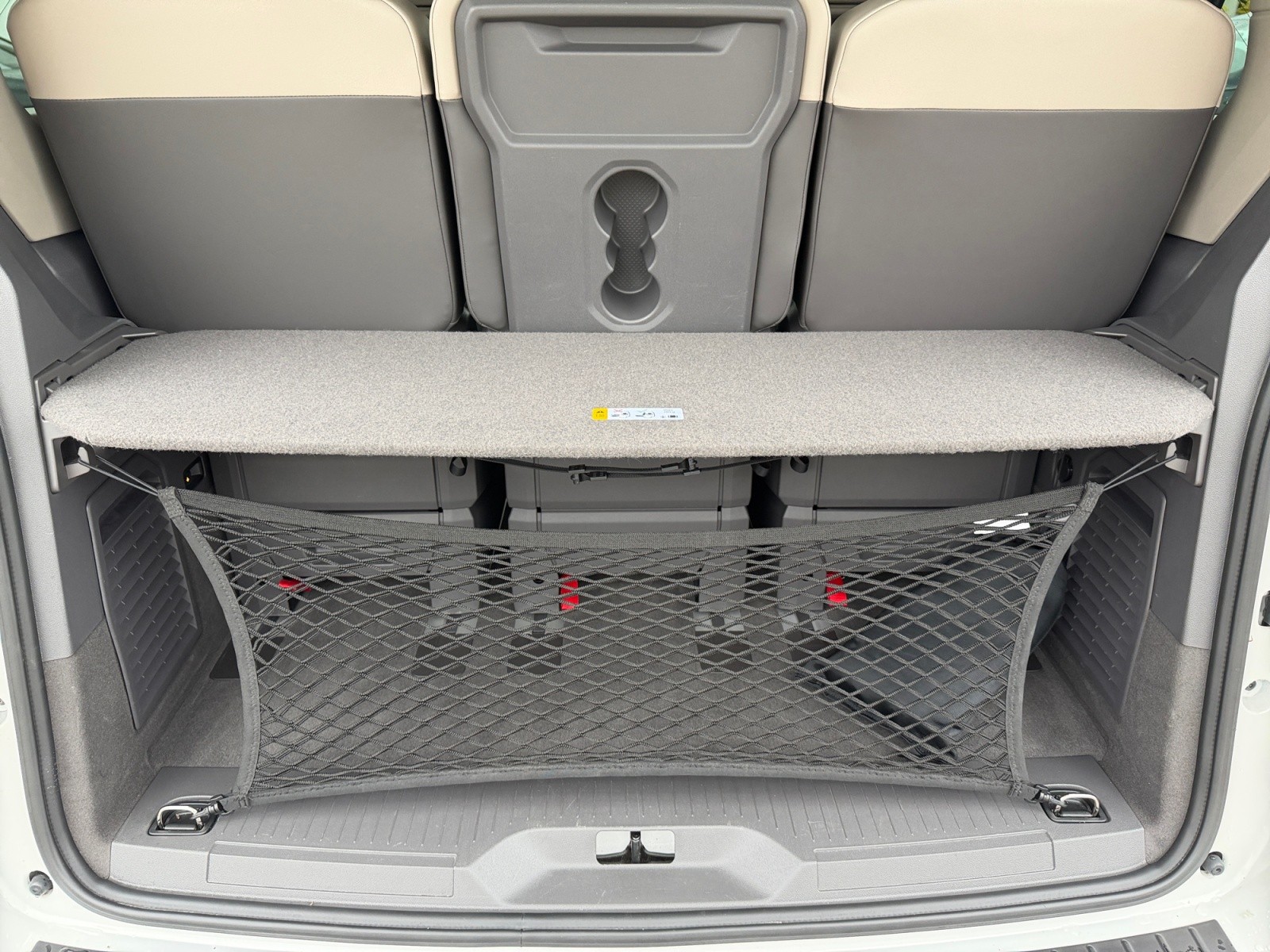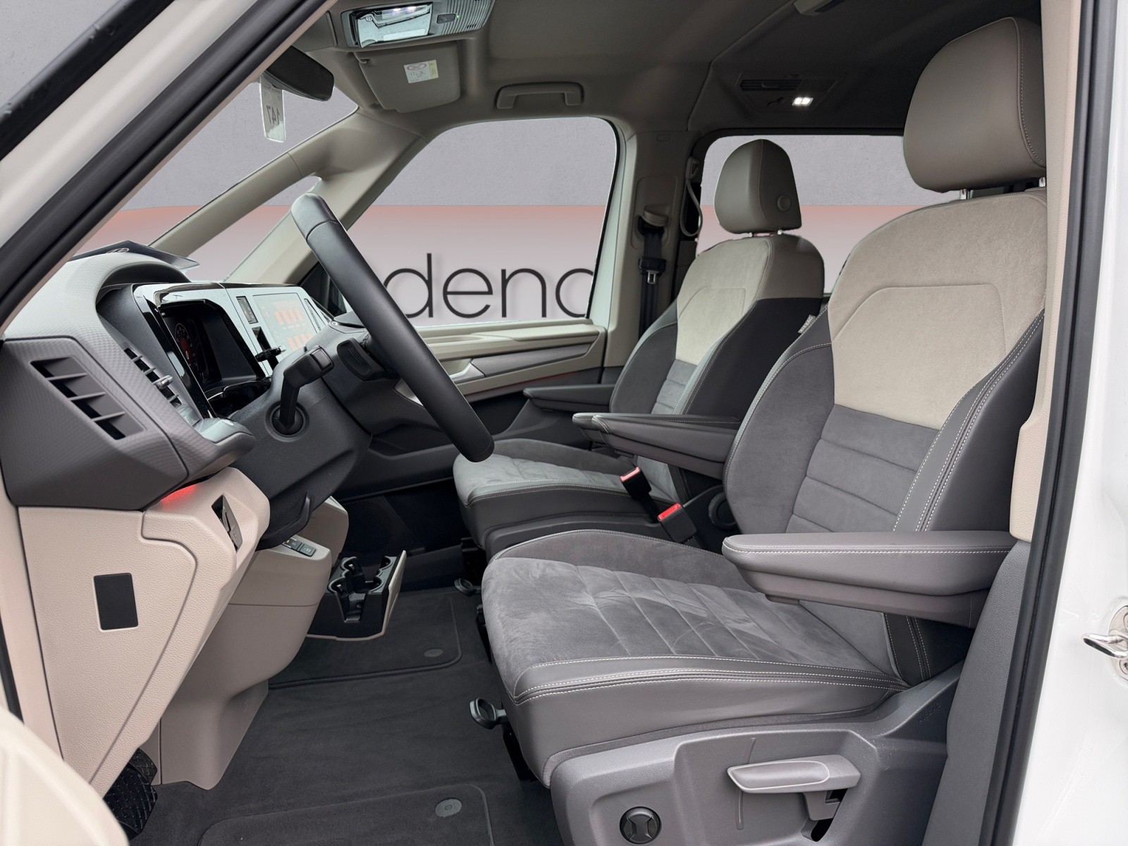 Rückfahrkamera 'Rear View', Bi-Color Sitzbezüge Sitzmittelbahnen inMikrovlies 'ArtVelours' Sitzwangen in Glattlederoptik, Automatische Distanzregelung ACC 'stop & go' mit Geschwindigkeitsbegrenzer, Scheiben im Fond stark abgedunkelt, Umfeldbeleuchtung an der Heckklappe und Ambientebeleuchtung 30-farbig inklusiveFußraumbeleuchtung für die 2. Sitzreihe, 7-Sitzer-Paket = 2-2-3 Vis-a-Vis, Fahrassistent 'Travel Assist' und 'Emergency Assist', IQ.LIGHT-LED-Matrix-Scheinwerfer mit LED-Tagfahrlicht, LED-Rückleuchten abgedunkelt, Anhängevorrichtung anklappbar mit elektrischer Entriegelung (einschließlich Gespannstabilisierung), Einparkhilfe im Front- und Heckbereich, Heckklappe mit elektrischer Öffnung undSchließung, 3 Einzelsitze in der 3. Sitzreihe, Sitzheizung für beide Sitze im Fahrerhaus links und rechts getrennt regelbar, 2 Einzelsitze entgegen der Fahrtrichtung(Vis-a-Vis-Ansicht) in der 2. Sitzreihe, Frontscheibe in Verbundsicherheitsglas wärme- und geräuschdämmend beheizbar, App-Connect inklusive App-Connect Wireless für Apple CarPlay und Android Auto, Zentralverriegelung mit schlüssellosem Schließ- und Startsystem 'Keyless Advanced' ohne Safesicherung, Schiebetür links elektrisch mit 'easy open'- und 'easy close' Funktion, Schiebetür rechts elektrisch mit 'easyopen'- und 'easy close' Funktion, Radio 'Ready 2 Discover' mit 25 4 cm (10') Touch-Farbdisplay, Fahrerassistent 'Travel Assist' inklusive Spurhalteassistent 'Lane Assist' und 'Emergency Assist', Digital Cockpit Pro, Spurwechselassistent 'Side Assist' inklusive 'Blind Spot Detection' Ausparkassistent und Ausstiegswarner, 3-Zonen Klimaanlage 'Air Care Climatronic' mit zusätzlichem Bedienteilim Fahrgastraum (nicht beim Beach), EU6 4-Zylinder-Ottomotor 2 0l R4 150 kW (204 PS) TSI, 7-Gang-Doppelkupplungsgetriebe DSG, Verkehrszeichenerkennung, Digitaler Radioempfang, 2 USB-C-Schnittstellen vorn 4 USB-C-Ladebuchsen im Fahrgastraum, Servolenkung geschwindigkeitsabhängig (Servotronic), Multifunktions-Lederlenkrad mit Schaltwippen, Sitz links & rechts mit Höhenverstellung und 2-Wege-Kopfstütze in der 1. Sitzreihe, Abgasnorm Euro 6d ISC-FCM, Fenster in der Schiebetür links, Ausweichunterstützung und Abbiegeassistent, Fenster in der Schiebetür rechts, Sicherheitsinnenspiegel automatisch abblendend, Armlehnen für Fahrer- und Beifahrersitz beidseitig mit elektrischer Lendenwirbelstütze und Klapptisch, Airbags für Fahrer und Beifahrer mit Beifahrer-Airbag-Deaktivierung, Bodenbelag im Fahrgastraum mit trittverstärktem Velours-Teppichboden, Dekor-Einlagen 'Dark Silver Brushed', Seiten- und Kopfairbag für Fahrer und Beifahrer Kopfairbags für die äußerenSitzplätze hinten und Mittenairbag vorn, Sonnenblenden mit Spiegel beleuchtet Tickethalter auf der Fahrerseite mit Airbaglabel auf Sonnenblende und B-Säule, Leiste zwischen den Scheinwerfern Schwarz glänzend lackiert mit zwei Chromleisten, Scheibenwischer-Intervallschaltung mit Regensensor für die Frontscheibenwischer, Notbremsassistent 'Front Assist' mit Fußgänger- und Radfahrererkennung, Tagfahrlichtschaltung mit Assistenzfahrlicht sowie 'Coming home' und 'Leaving home'-Funktion, Warnton und -leuchte für nicht angelegteSicherheitsgurte vorn und hinten,