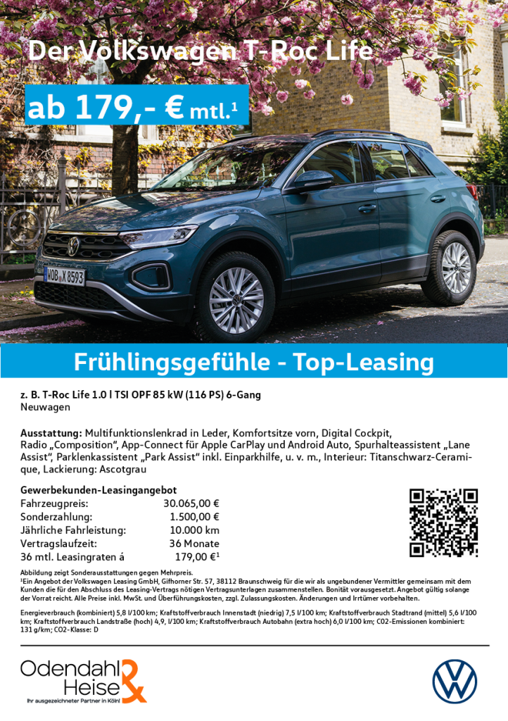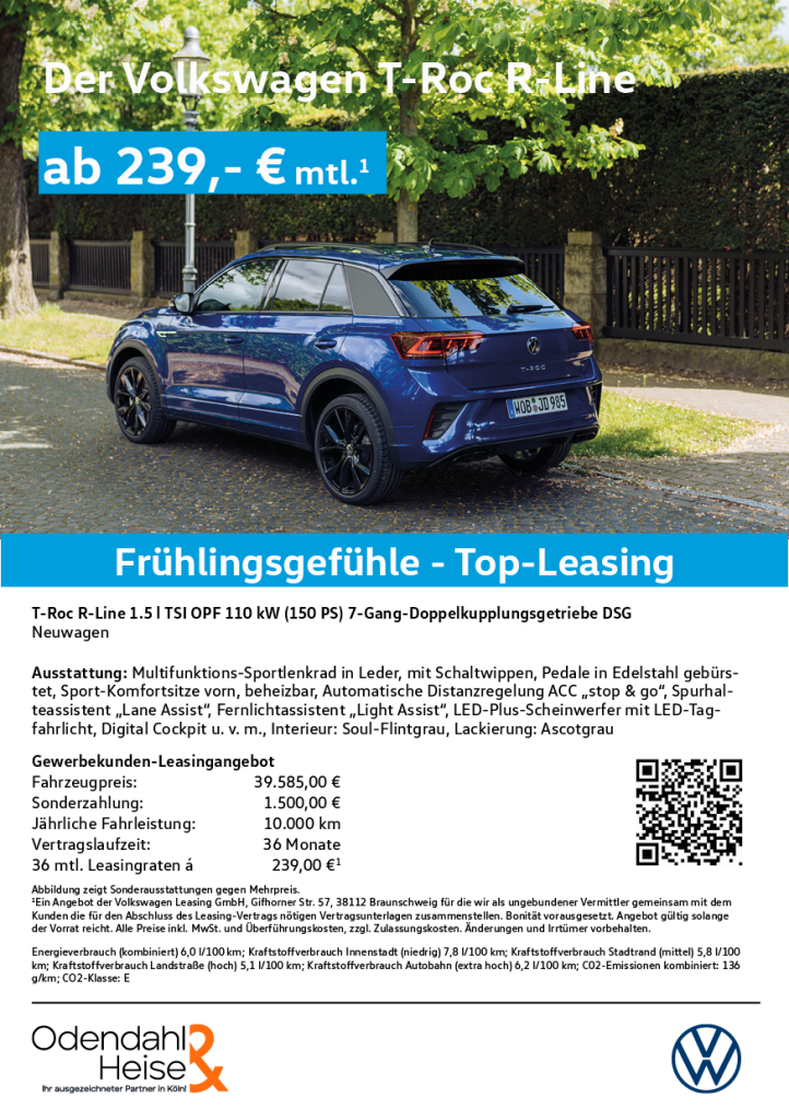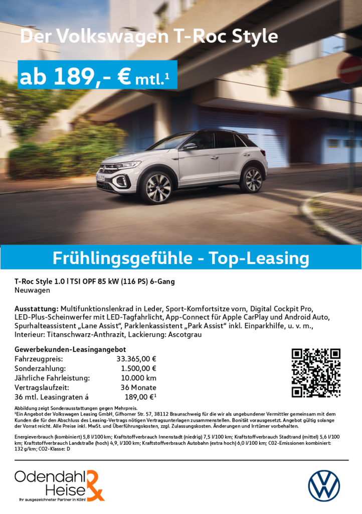 Starte in den Frühling mit exklusiven Sonderleasing-Angeboten für den Volkswagen T-Roc. Wähle aus vielen sofort verfügbaren Konfigurationen – aber nur solange der begrenzte Lagerbestand reicht. Sicher dir jetzt dein individuelles Angebot und fahre schon bald deinen Traum-SUV!