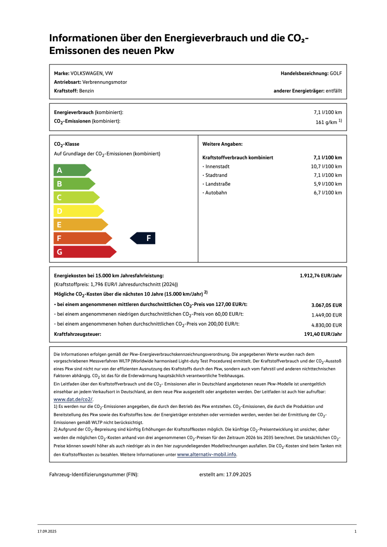 Energieverbrauch kombiniert: 7,1 l/100km und CO₂-Emission kombiniert: 161 g/km | CO₂-Klasse: F